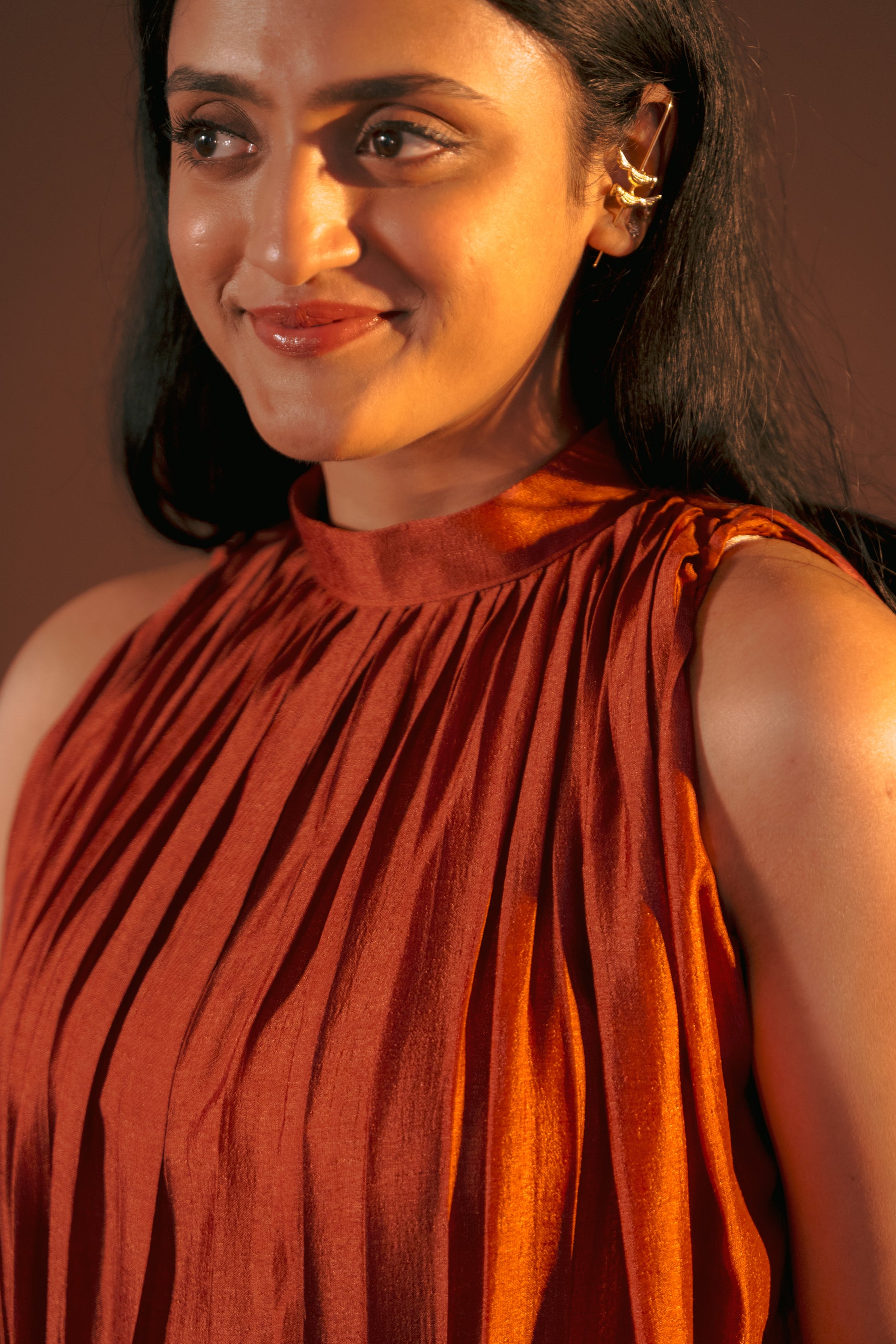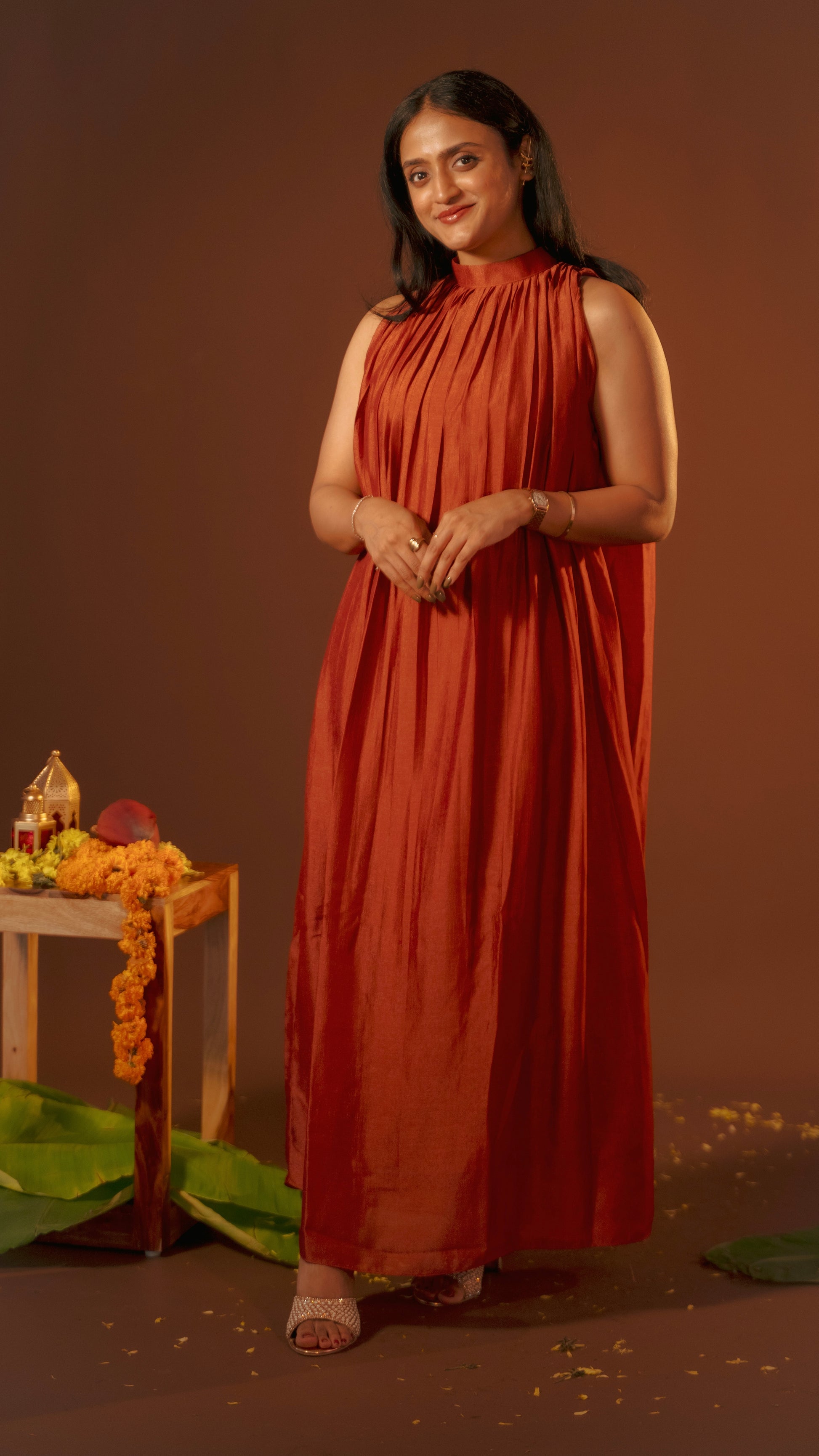 Discover effortless elegance with the Blush Breeze Maxi Dress, crafted to accompany you through every Onam moment. Its high gathered collar creates a graceful neckline, while flowing pleats flatter all body types without cling. Designed for comfort and ease, this burnt onion pink dress moves freely—perfect for the joyous sadhya feast or light dance celebrations. Versatile and refined, style it with statement jhumkas and heels or enjoy a barefoot, carefree vibe. A thoughtful blend of style and comfort, this dress adapts to your mood and rhythm seamlessly.