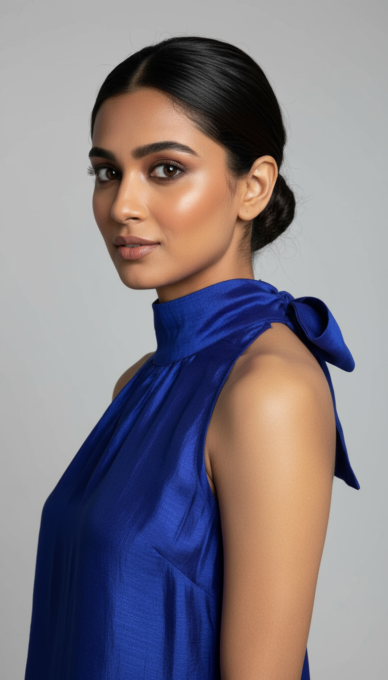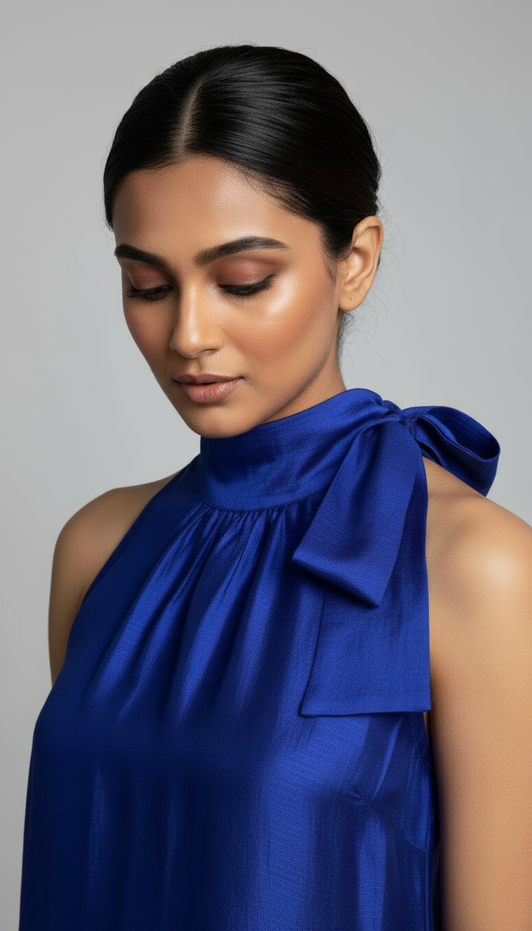 Elevate your wardrobe with the Sapphire Dreams Halter Top, crafted from royal blue Kashmiri georgette. This piece features a subtle sheen and lightweight texture, enhanced by a distinctive bow tie at the back for refined style. Perfect for both daytime gatherings and evening events, it combines comfort with sophisticated design to ensure you stand out effortlessly.