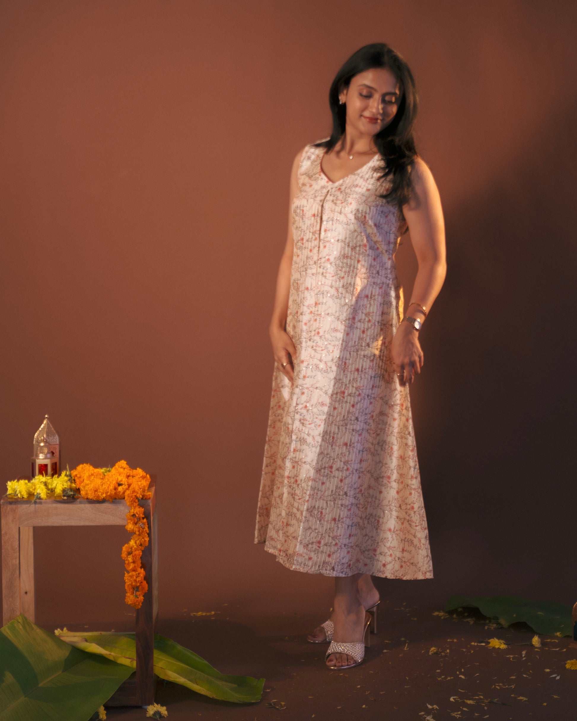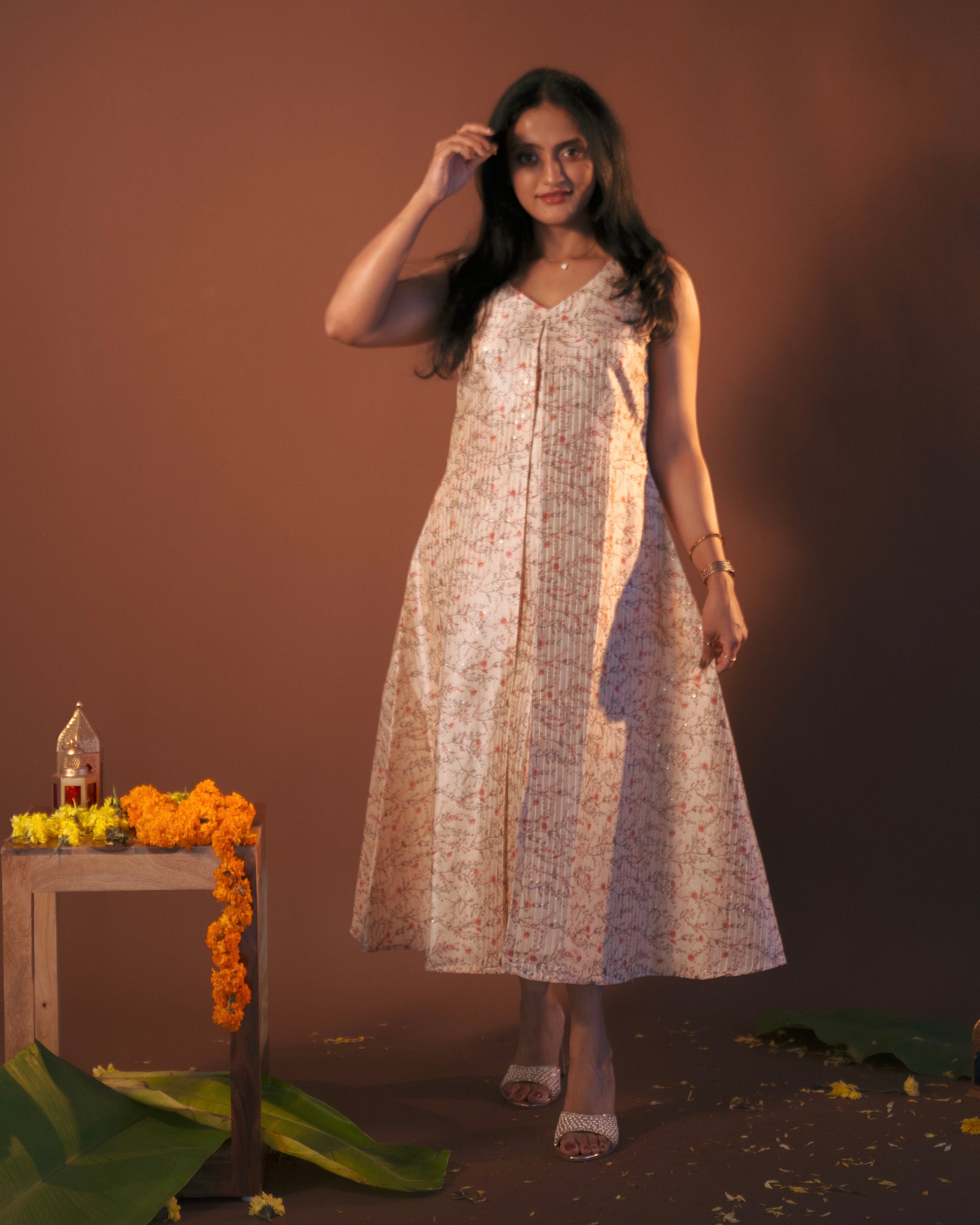 The Starlight Shimmer Dress combines effortless elegance with subtle sparkle. Its soft pleats and center tuck detail create graceful movement, perfect for a flawless twirl. Lightweight and comfortable, the dress features a flattering neckline that frames your face beautifully, ideal for long festive celebrations. Delicate sequins add a refined shimmer, capturing light with every step. Whether at an Onam Sadya or an evening gathering, this dress ensures you stand out with timeless charm and sophisticated style.